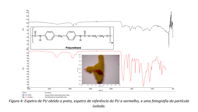 Na Figura 3 apresentam-se duas fotografias das amostras n.º 52 da campanha do NRP Sagres (a), e n.º 33 da campanha “Mar Aberto” (b), exemplificativas das partículas encontradas. Apresenta-se na Figura 4 o espetro obtido no equipamento de micro-espectrometria de infravermelho PerkinElmer Spotlight 200i por transformada de Fourier (µFTIR), correspondente a uma das partículas que foi isolada tendo sido identificada como poliuretano (PU).